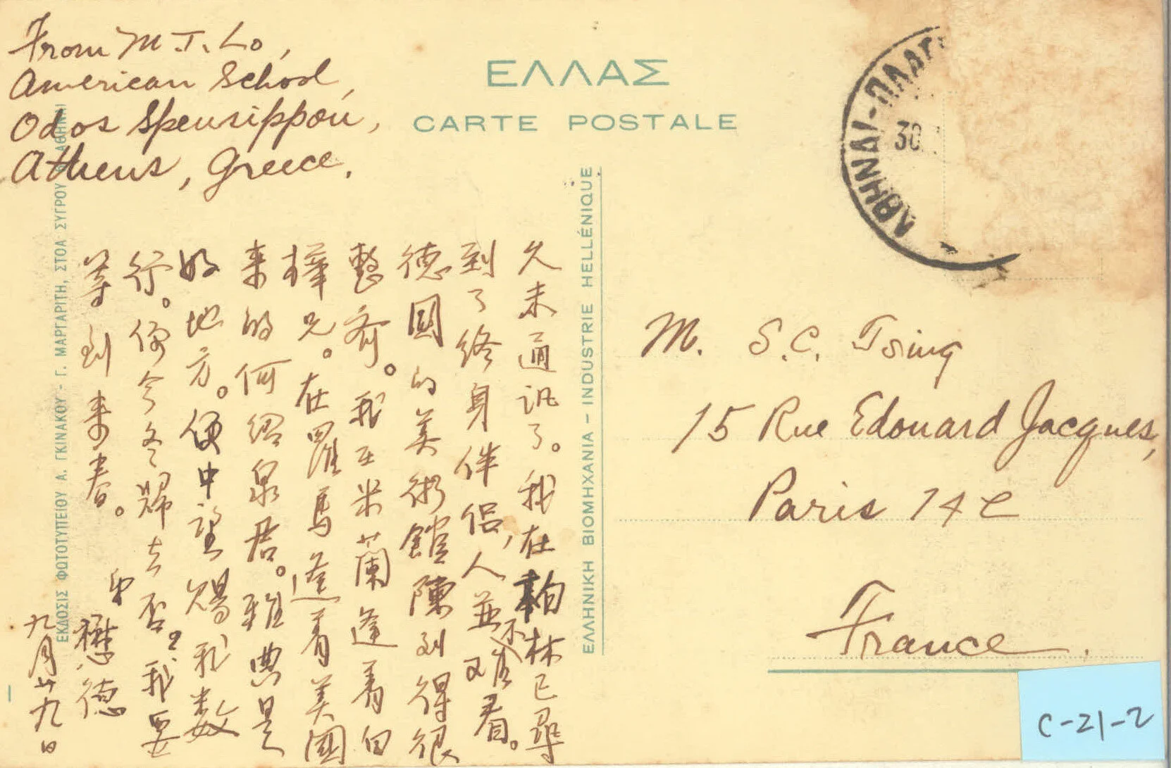 弟今晨到里昂,始知昨天已验过身体,弟须候下星期日再验,殊诲不在巴黎多盘桓数日!现巳迁入中法大学宿舍矣。景祥兄(注:张景祥)不幸末入选。据此间人云,想因景祥兄学费,太贵,中法大学不愿担任故。塞翁失马安知非福?此间非乐土,弟今后行止择交均不能不格外谨慎,匆匆。余后叙,此候巴黎清华同学公鉴。弟达元。
